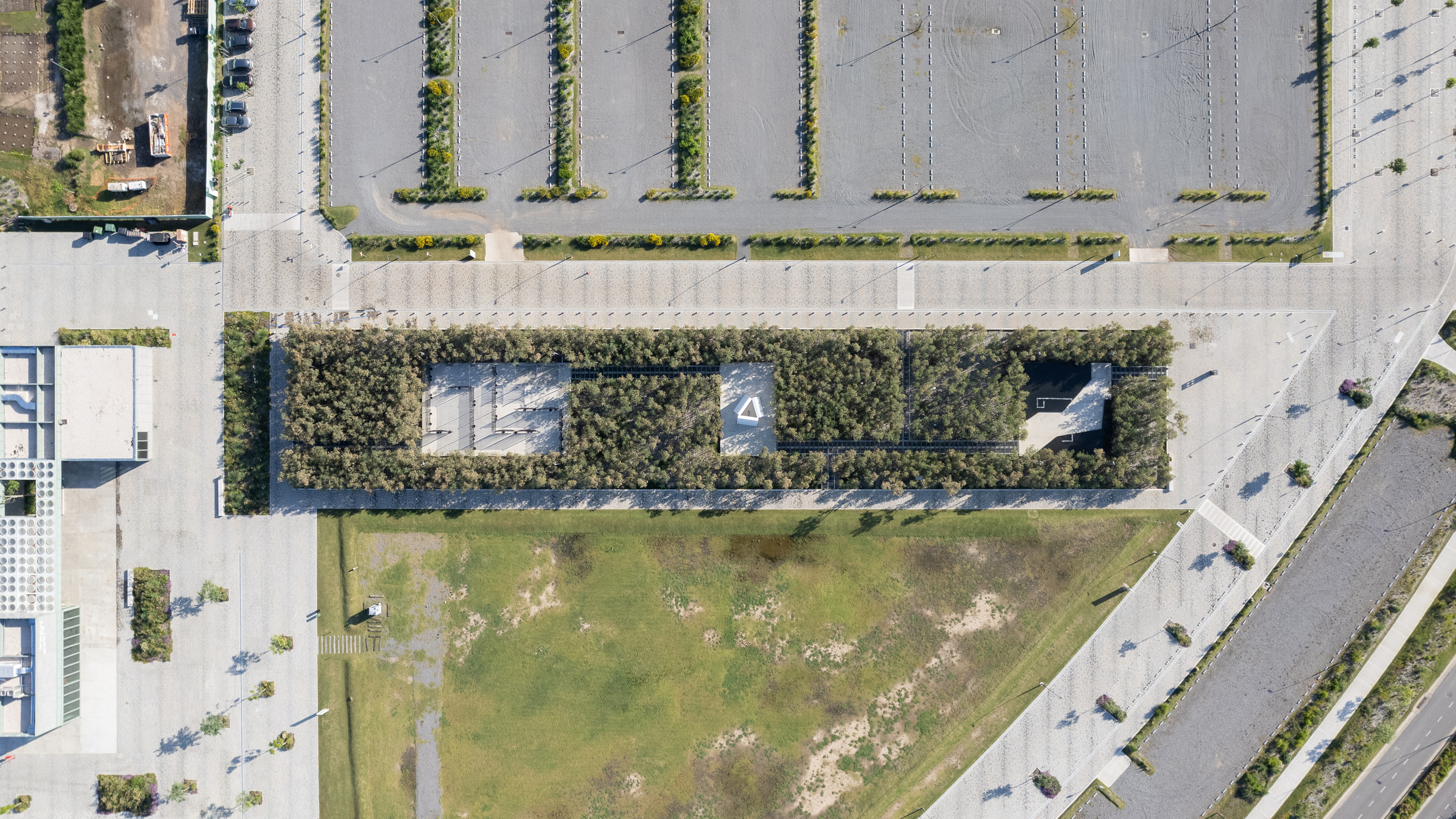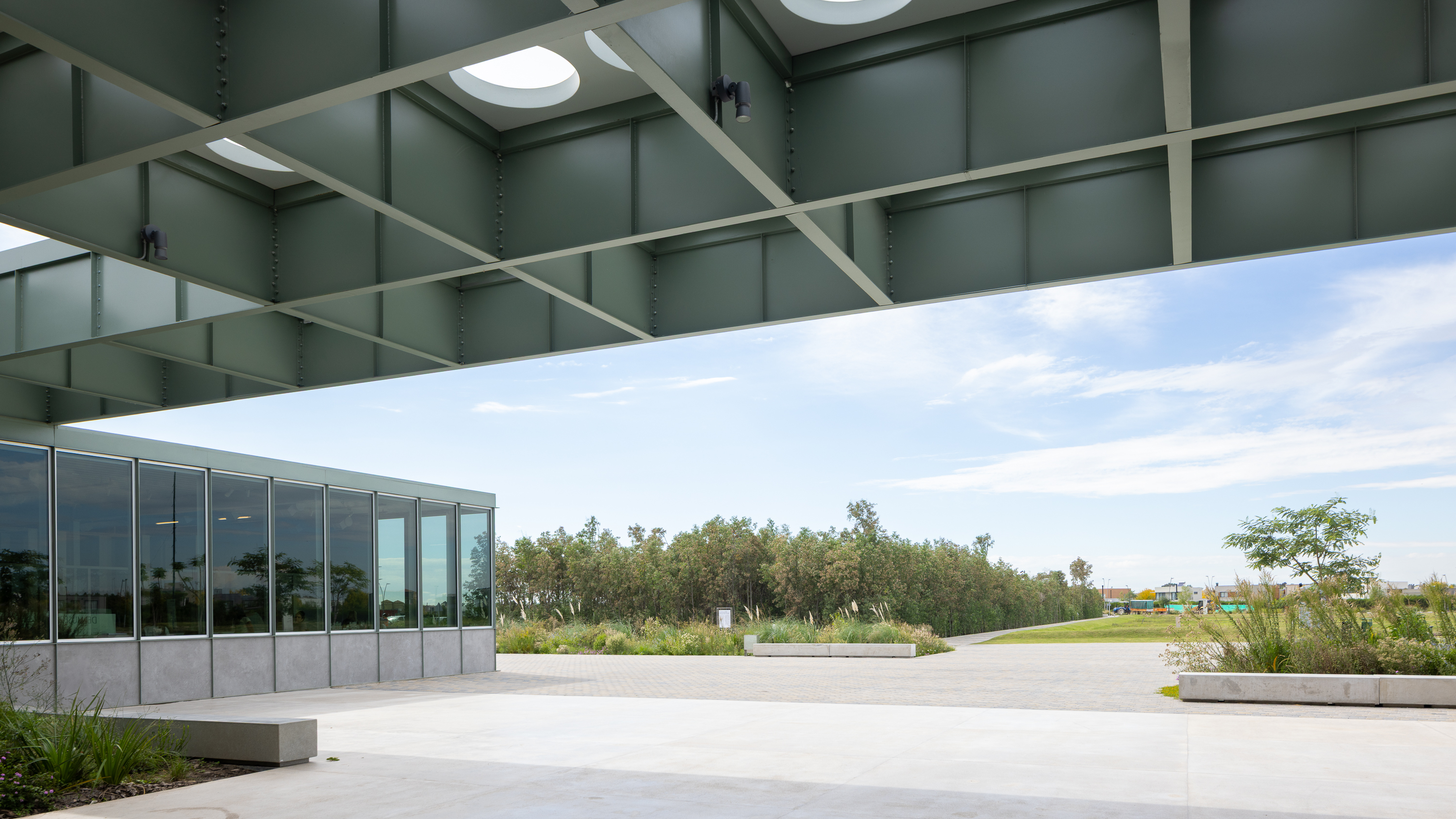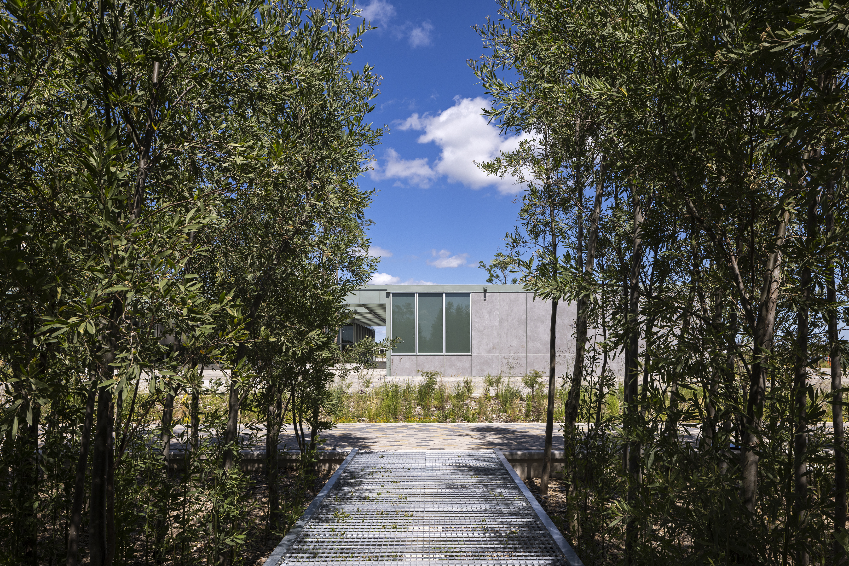 El proyecto se define como un friso vegetal de ciento cincuenta metros que se cola entre los edificios, dialoga y es parte de una operación urbanística. Un lleno, un alisal artificial, que contiene tres salas genéricas y flexibles de 300, 200 y 115 m2 vinculadas a través de un sistema de pasarelas flotantes metálicas. Un recorrido que permite integrarse con la futura vida urbana a la vez que con las otras salas. Es peatonal y permite ser parte de una nueva experiencia de fluir, al menos por un instante.