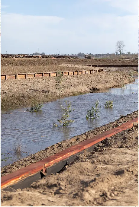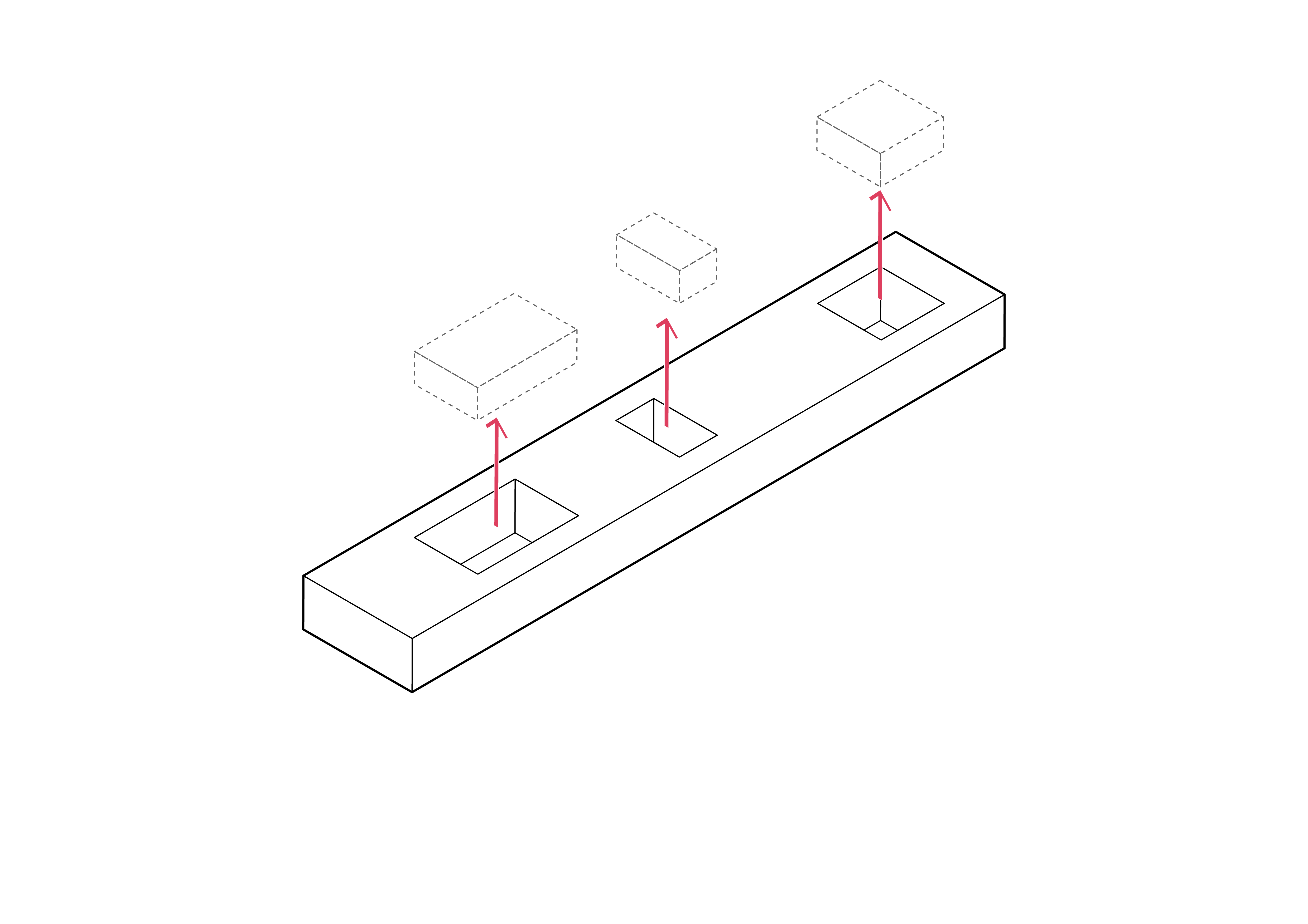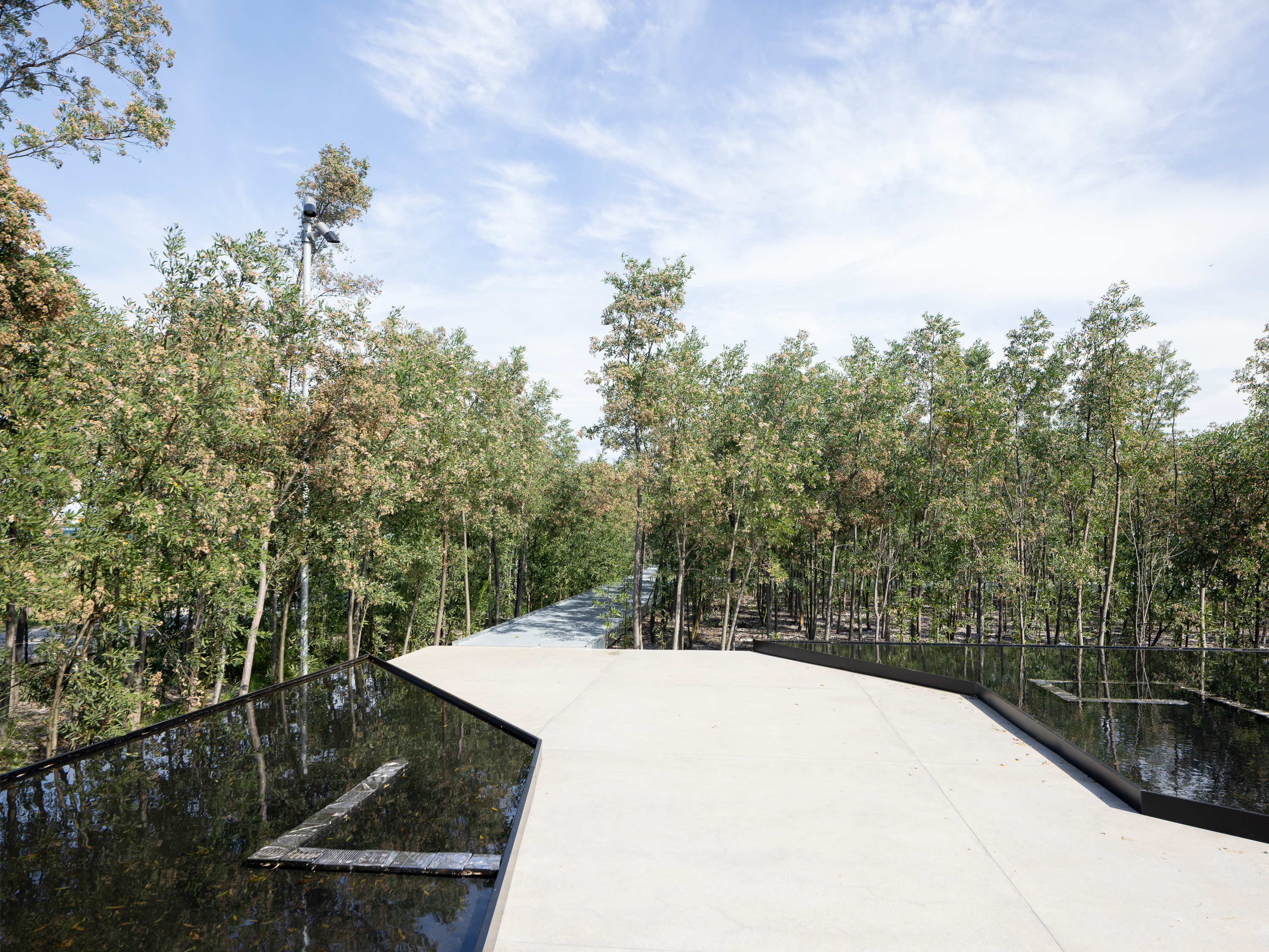 El proyecto se define como un friso vegetal de ciento cincuenta metros que se cola entre los edificios, dialoga y es parte de una operación urbanística. Un lleno, un alisal artificial, que contiene tres salas genéricas y flexibles de 300, 200 y 115 m2 vinculadas a través de un sistema de pasarelas flotantes metálicas. Un recorrido que permite integrarse con la futura vida urbana a la vez que con las otras salas. Es peatonal y permite ser parte de una nueva experiencia de fluir, al menos por un instante.