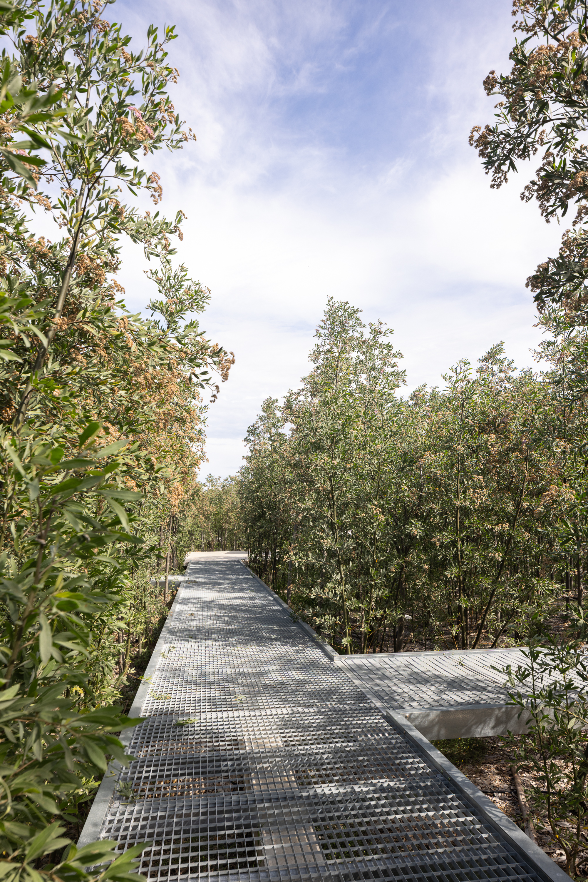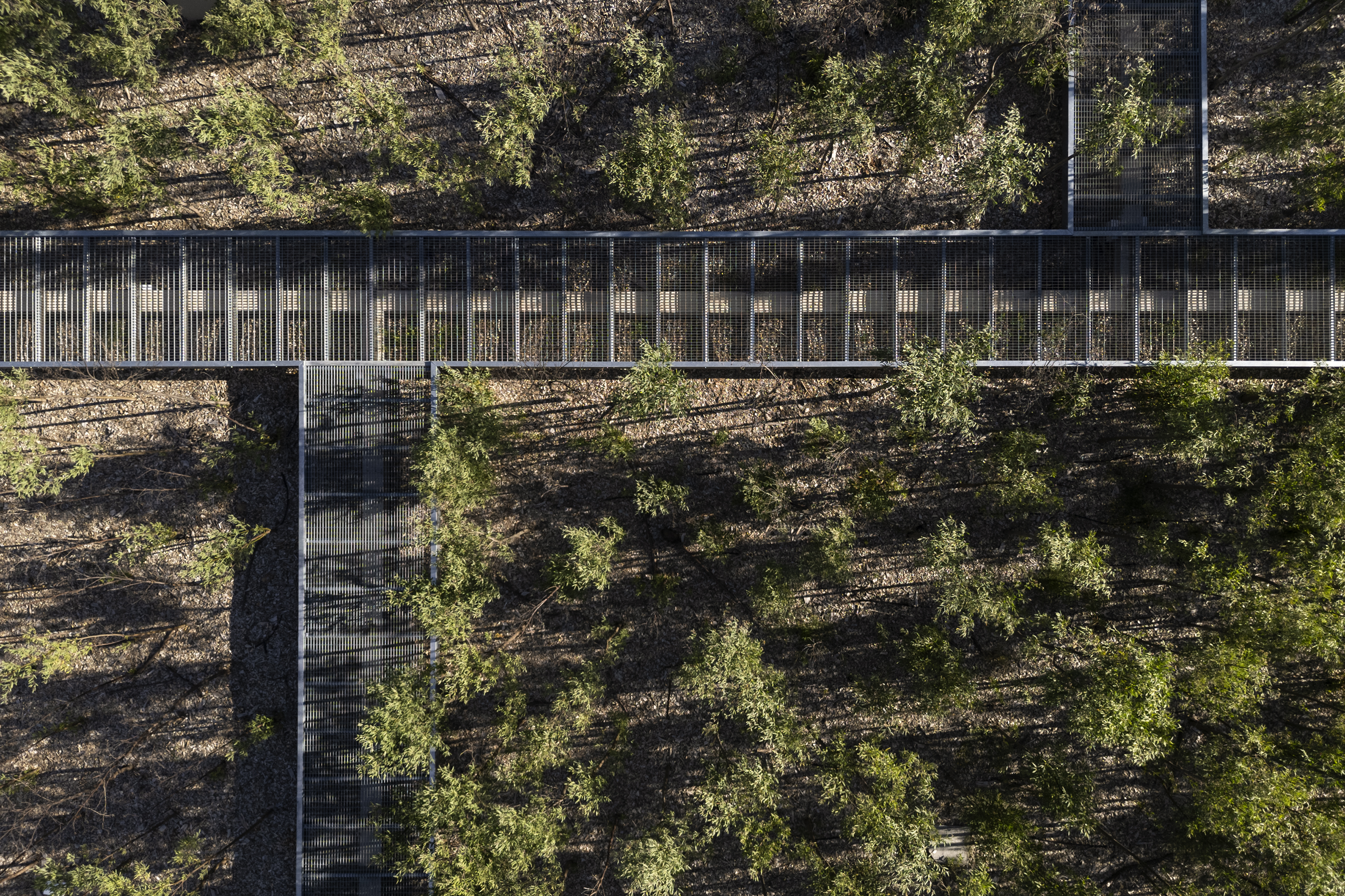 Cada sala soporta hasta 3 toneladas abiertas a recibir diversas actividades culturales, con diversas capacidades e intimidades. Incluso, funcionan como tres salas independientes. Diseñamos un sistema modular de solados monolíticos con juntas de aluminio que permitirían iluminar desde abajo el claro en el bosque. Cada pasarela flota apoyada en una viga longitudinal. Un emparrillado galvanizado nos permite caminar conscientes de lo que existe debajo nuestro: el suelo que habitamos. Las pasarelas, son piezas autónomas que apenas se acercan al volumen de la sala.